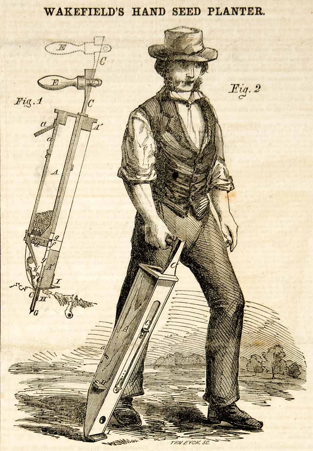 This is an original 1855 black and white in-text wood engraving of an improved hand seed planter –the invention of Charles Wakefield of Plainfield, MA.