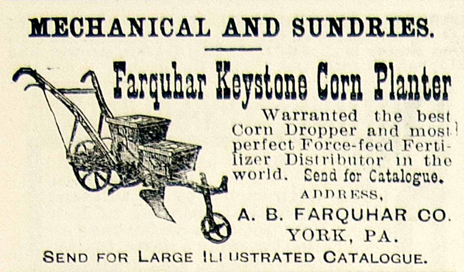 This is an original 1895 black and white print ad for the Keystone Corn Planter farm machine that was sold by the A.B. Farquhar Company.