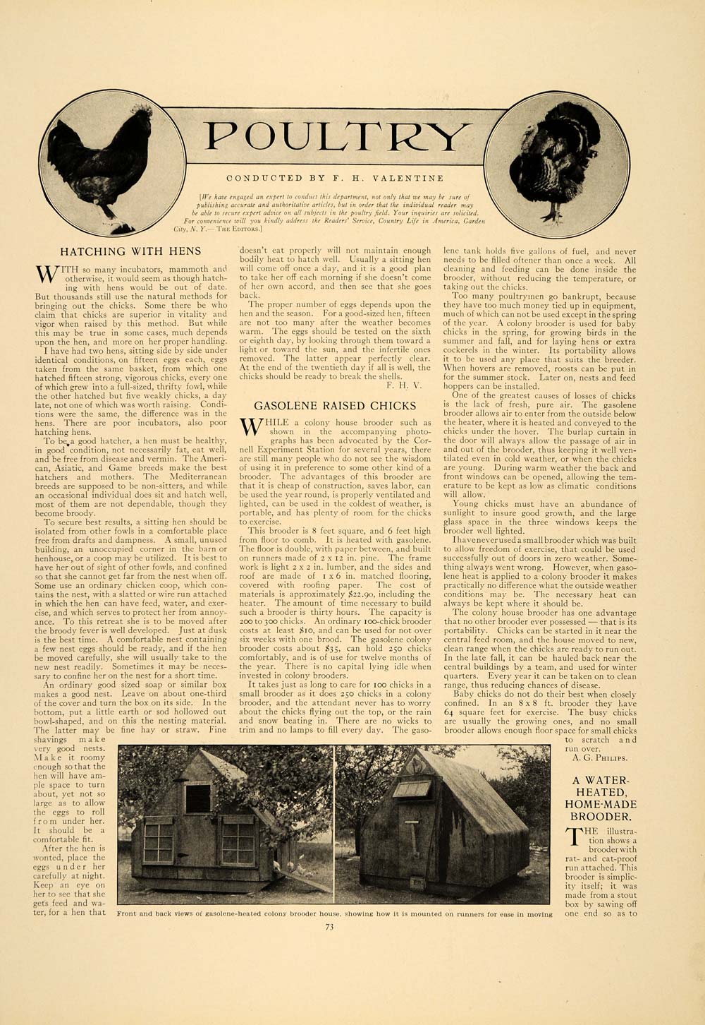This is an original 1913 2 page article titled, “Poultry,” conducted by F. H. Valentine. The article features sub-articles titled, “Hatching with Hens,” “Gasolene Raised Chicks,” “A Water-heated, Home-made Brooder,” “The Deman for Large Squabs,” and “Briefs for the Busy.” Please see additional images and note that the 2 pages are printed on 1 page– front and back.