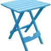 Brand Name: Adams Collection Name: Quik Fold Color: Seaglass Table Shape: Rectangular Tabletop Material: Resin Style: Folding Product Type: Side Table Frame Material: Resin UV Protected: Yes Weather Resistant: Yes Assembly Required: No Weight Capacity: 25 lb Height: 19.63 in. Width: 15.13 in. Length: 17.38 in. Weight: 2.75 lb Packaging Type: Boxed REASON ADDED New addition for 25′ The Quik-Fold Side Table provides a perfect accent table for the patio or pool, holding laptops, books, sunglasses, and more. Folds flat for out-of-the-way storage, making it the perfect accessory for camping or fishing trips. Use it in tight spaces, like dorm rooms where space is at a premium. Weighing in at only 3 pounds, it easily supports up to 25 pounds..Ideal size to complement patio chairs, adirondacks, or chaise lounges.Advanced locking mechanism keeps table firmly locked in open position.Fade-resistant resin is UV protected to prevent sun damage.Cleaning is simple, just wipe with a damp cloth.Durable resin material will not peel, rust, or rot.Folds quickly and compactly for storage..High-quality resin material is lightweight enough for everyone to handle.