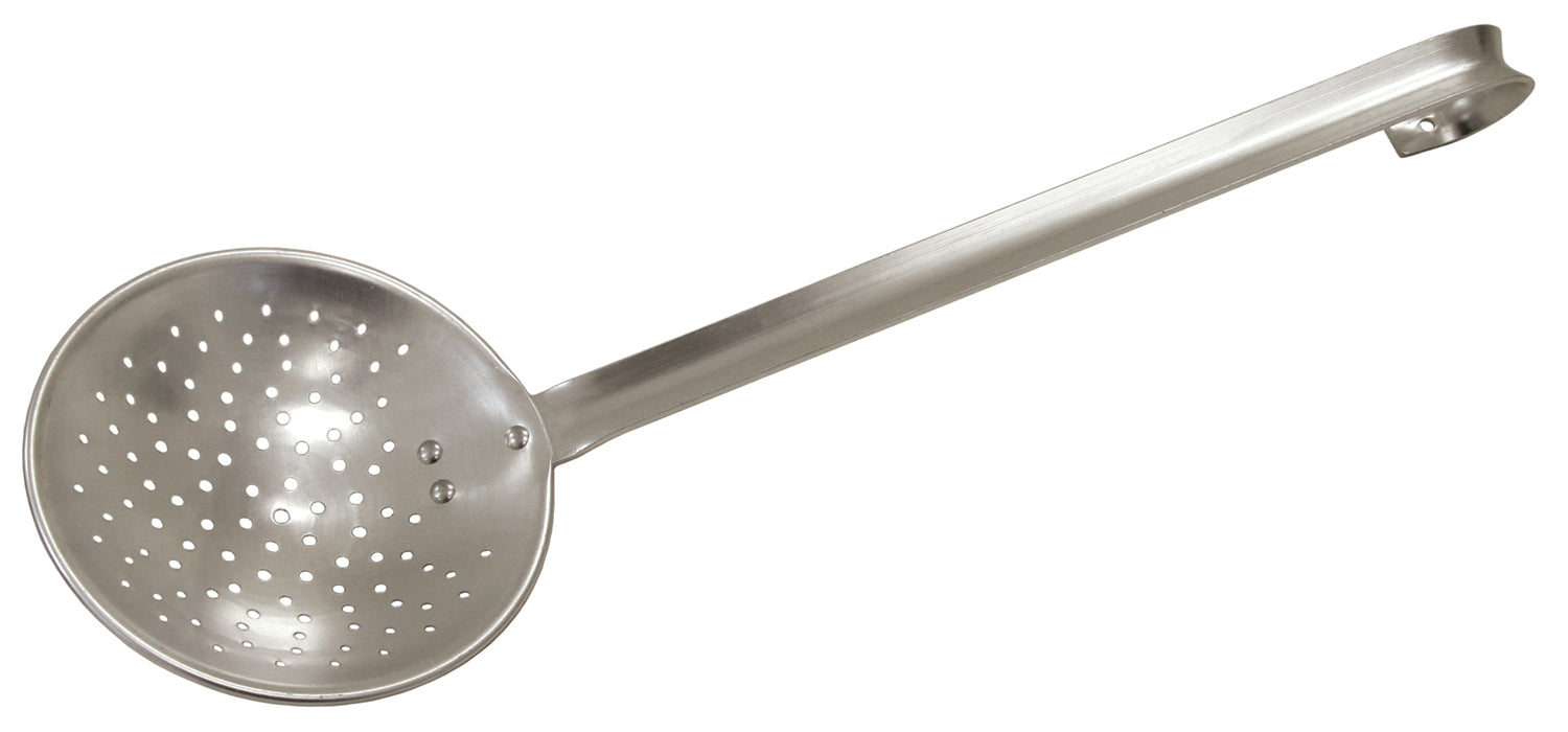- Slender skimmer easily removes foods from hot grease or boiling water